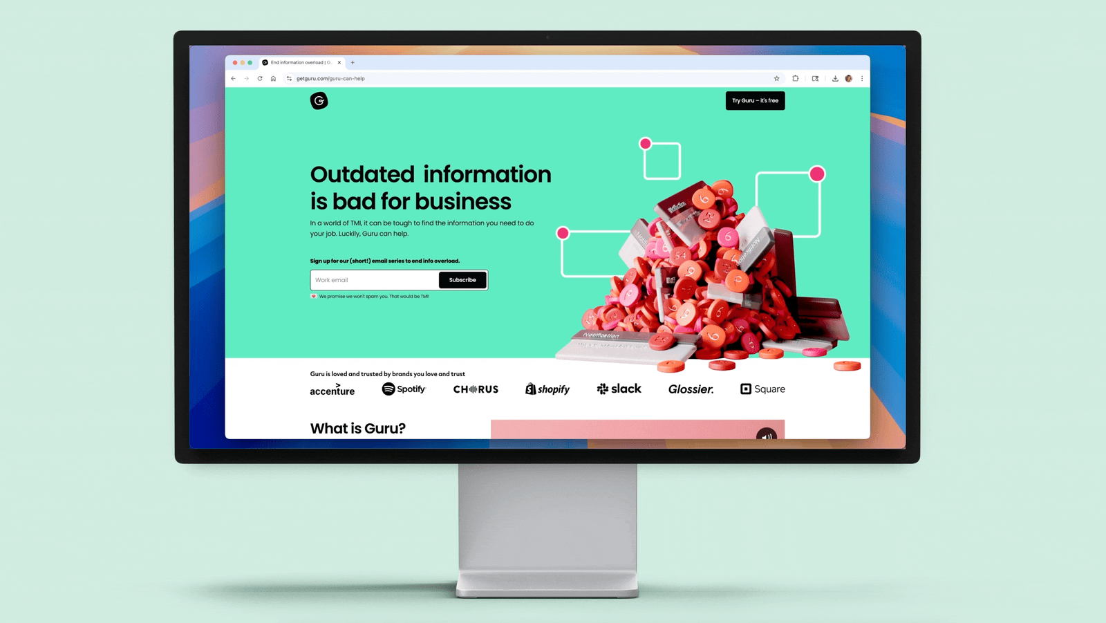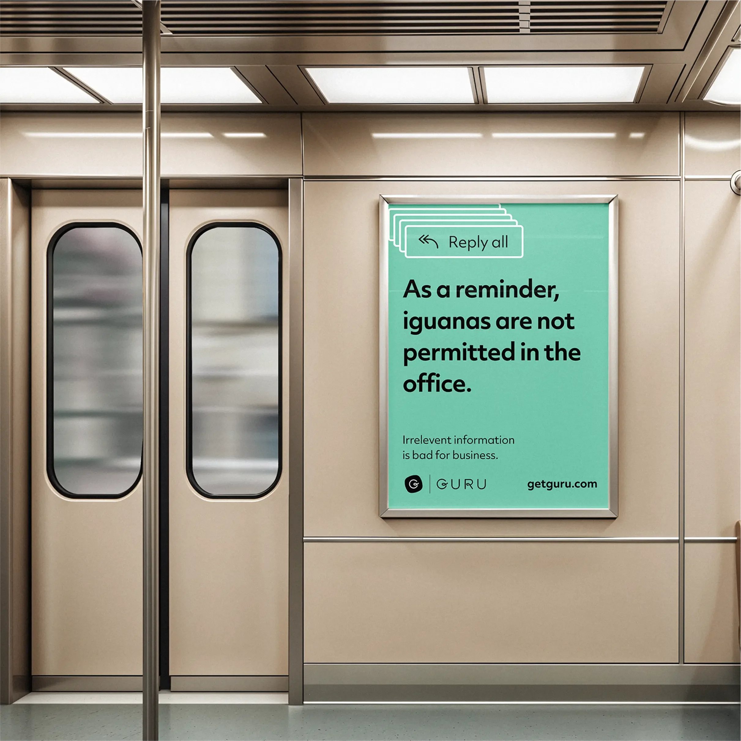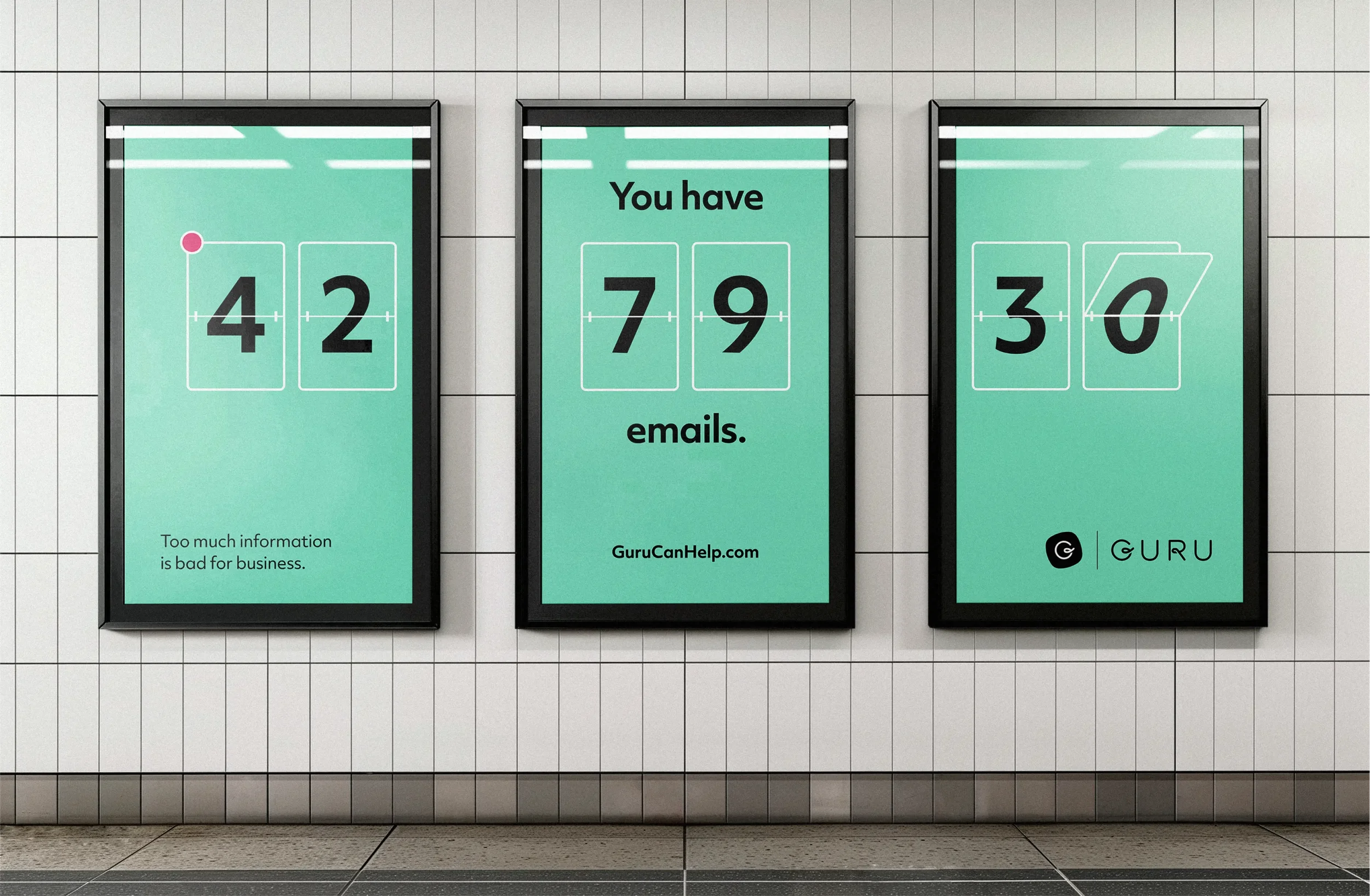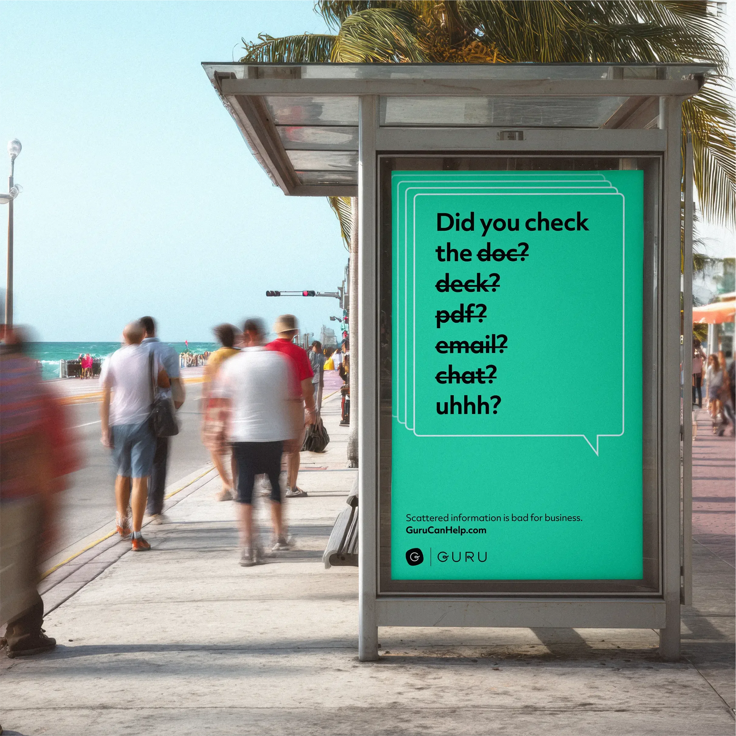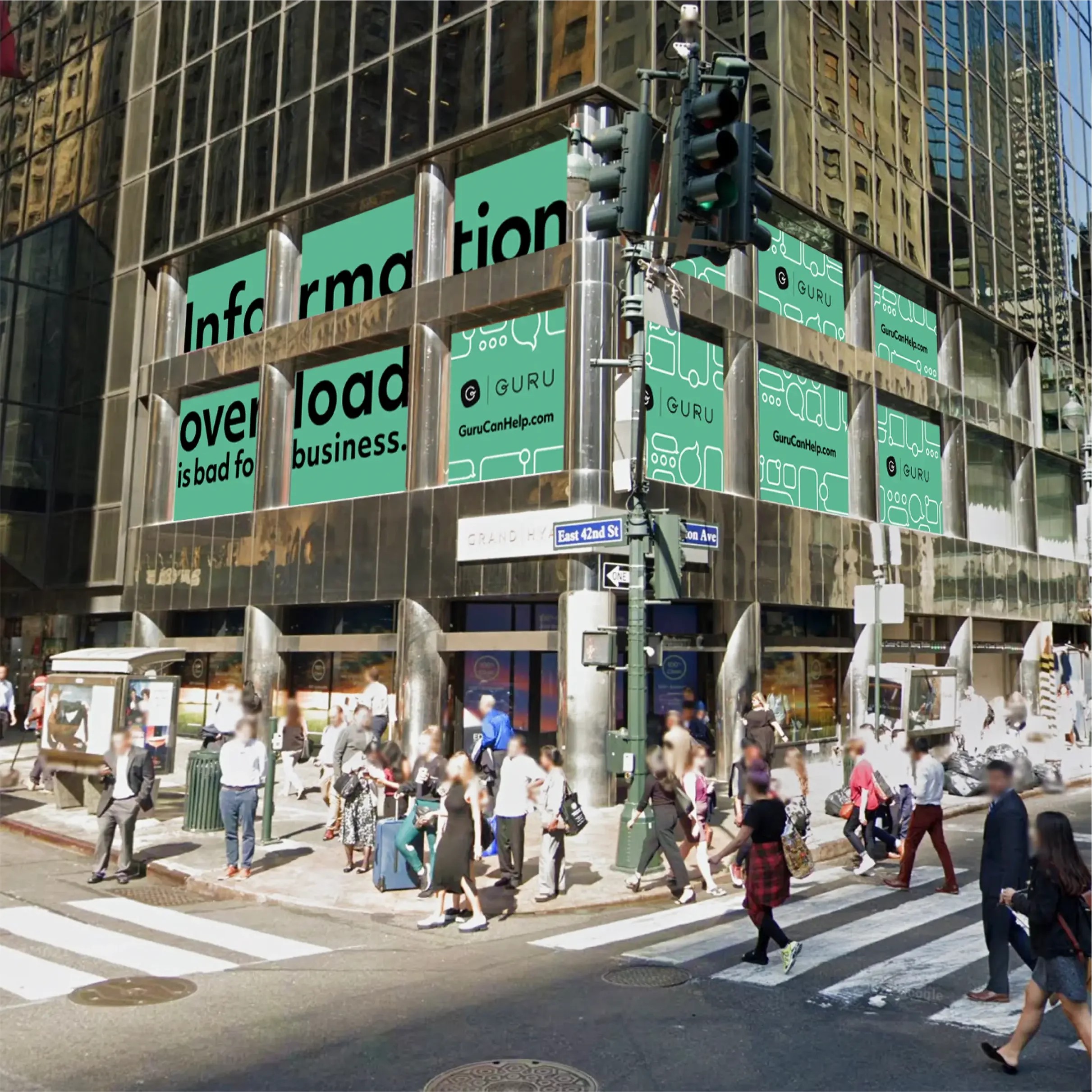To boost brand awareness, Guru launched an out-of-home campaign in New York, San Francisco, and Boston. Showing up on billboards, in subways, bus shelters, and even Grand Central Station, the concept tackled information overload and how Guru helps teams cut through the noise.