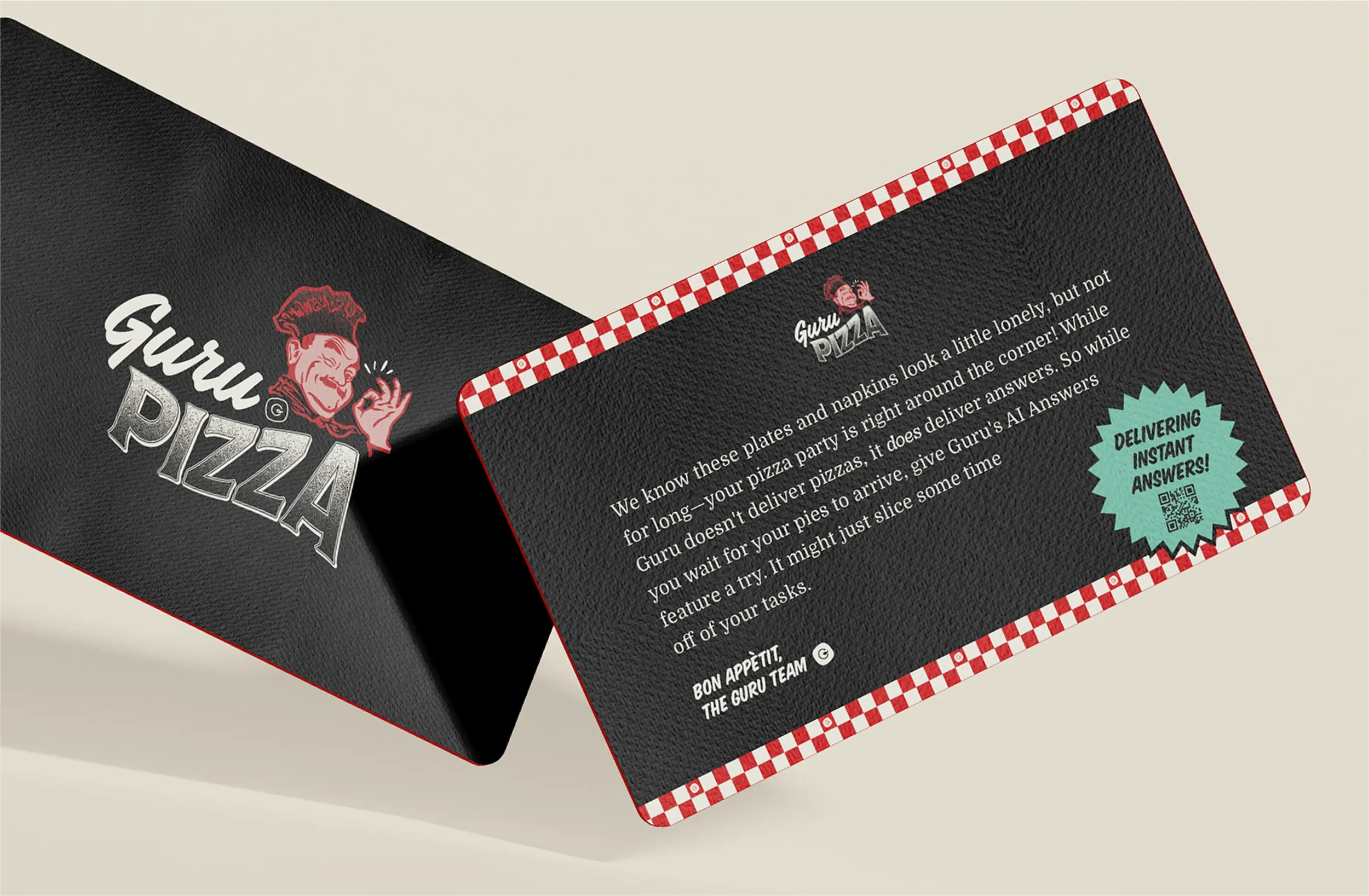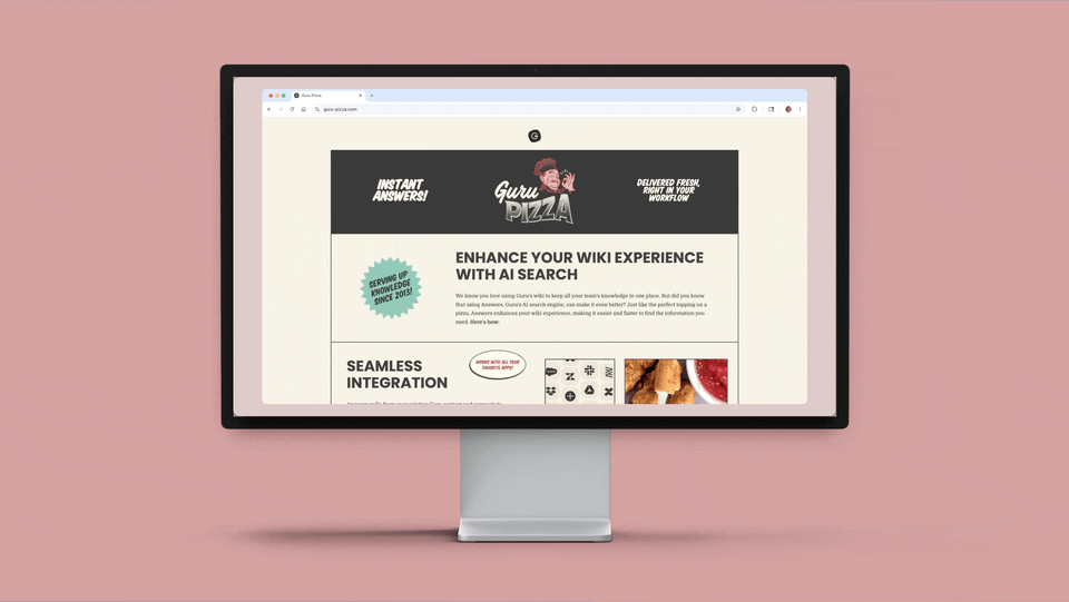 How do you get customers to start using an under-utilized feature? You turn into a pizza shop for the day. Guru Pizza was an account-based marketing campaign designed to drive adoption of Guru’s AI Answers, served with a side of fries. I created the full visual brand for the experience, from a website that looked like a classic pizzeria menu (but instead of listing toppings, it walked customers through the benefits of AI Answers), to custom-branded plates and napkins. Fresh pizza was delivered to customers and invited them to “order up” smarter workflows, turning a product push into something fun and totally unforgettable.