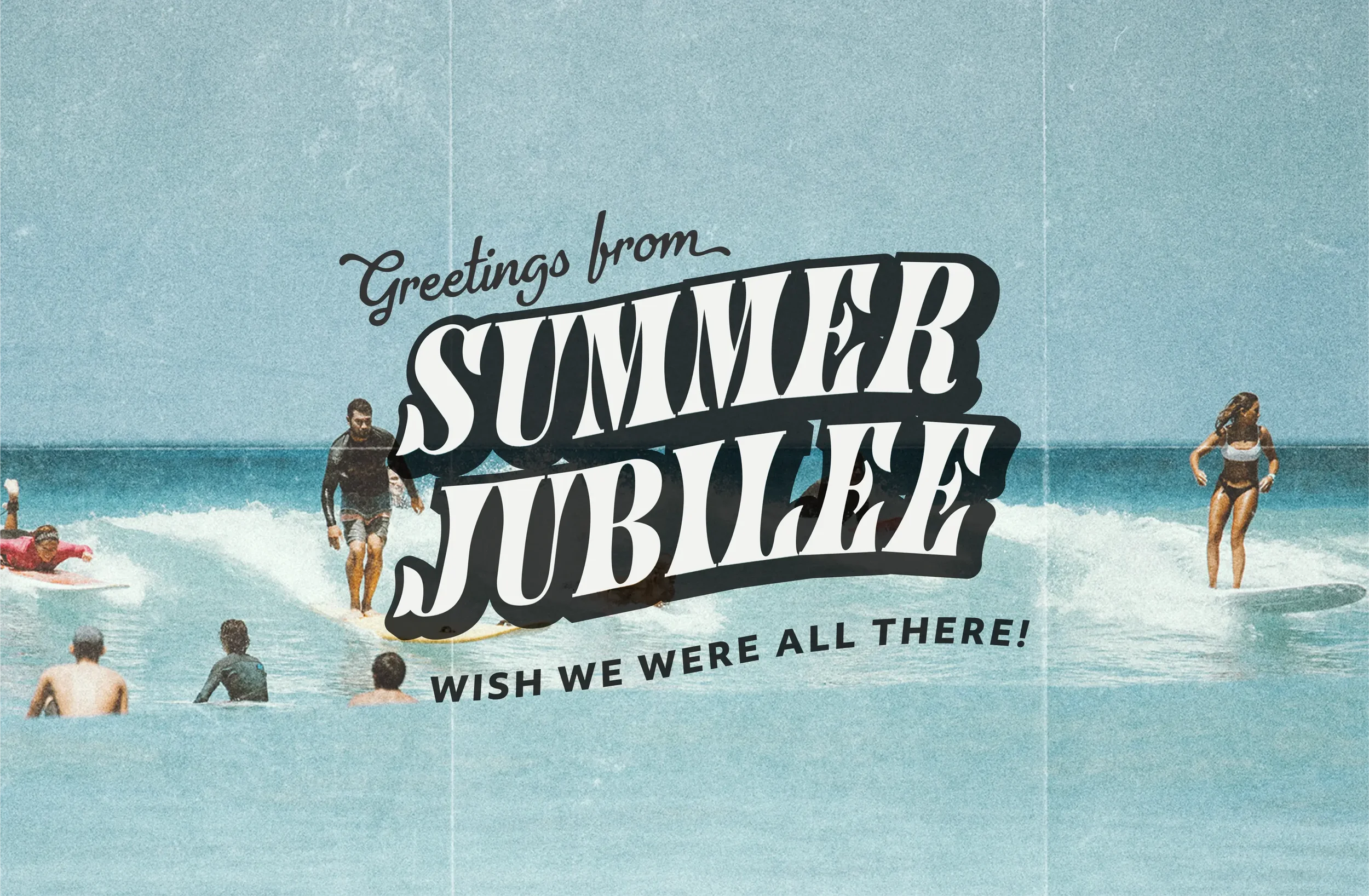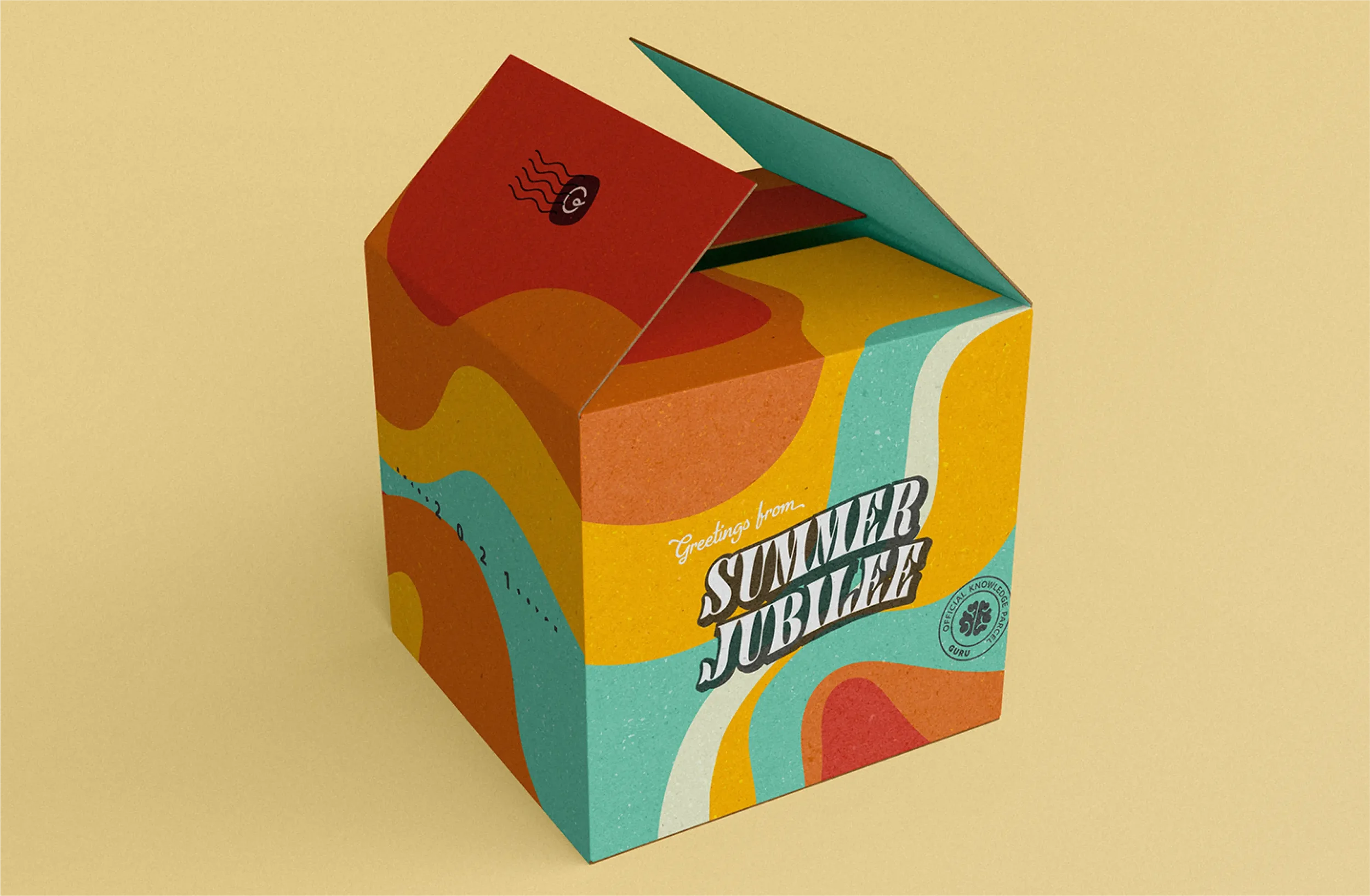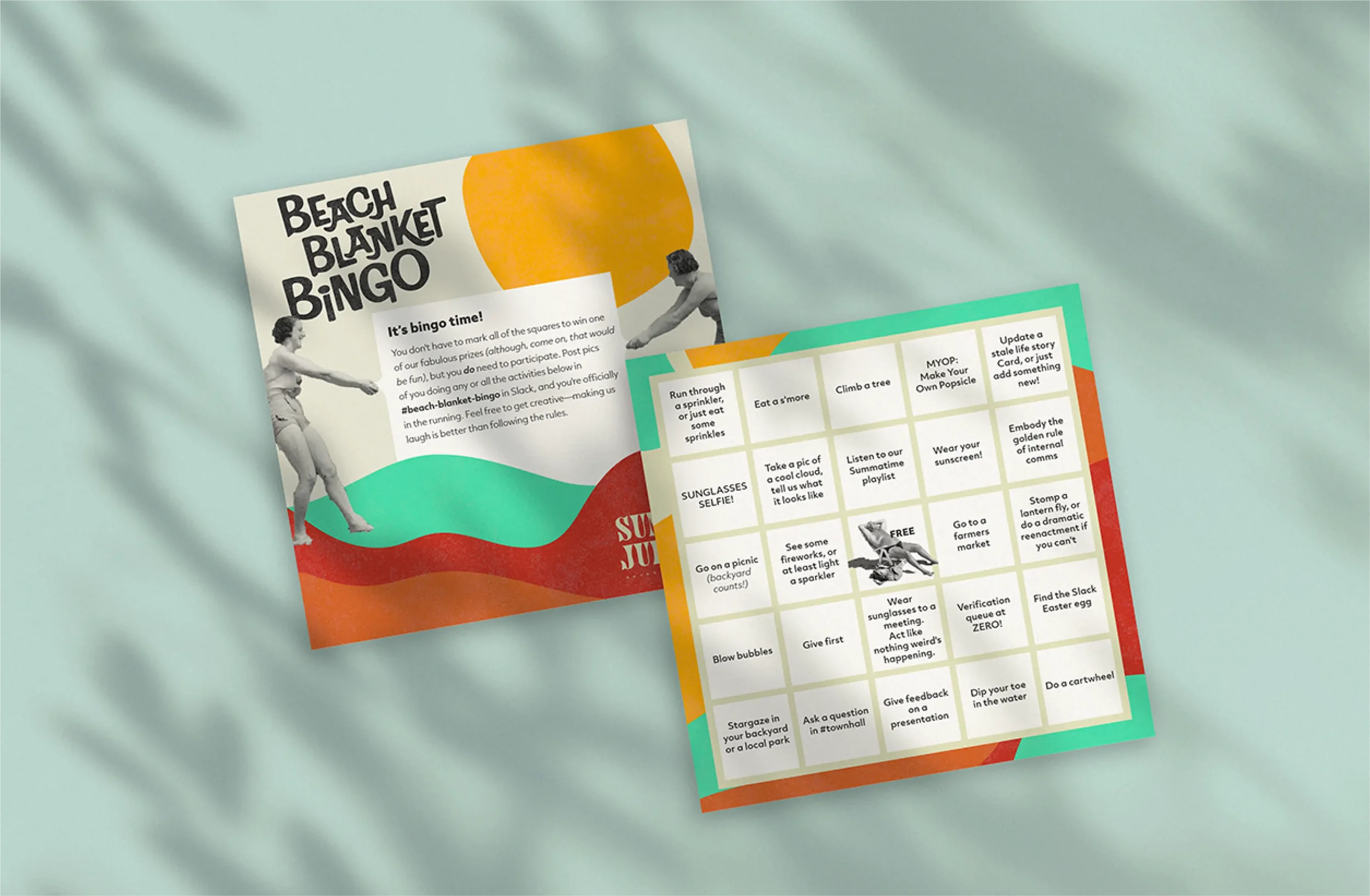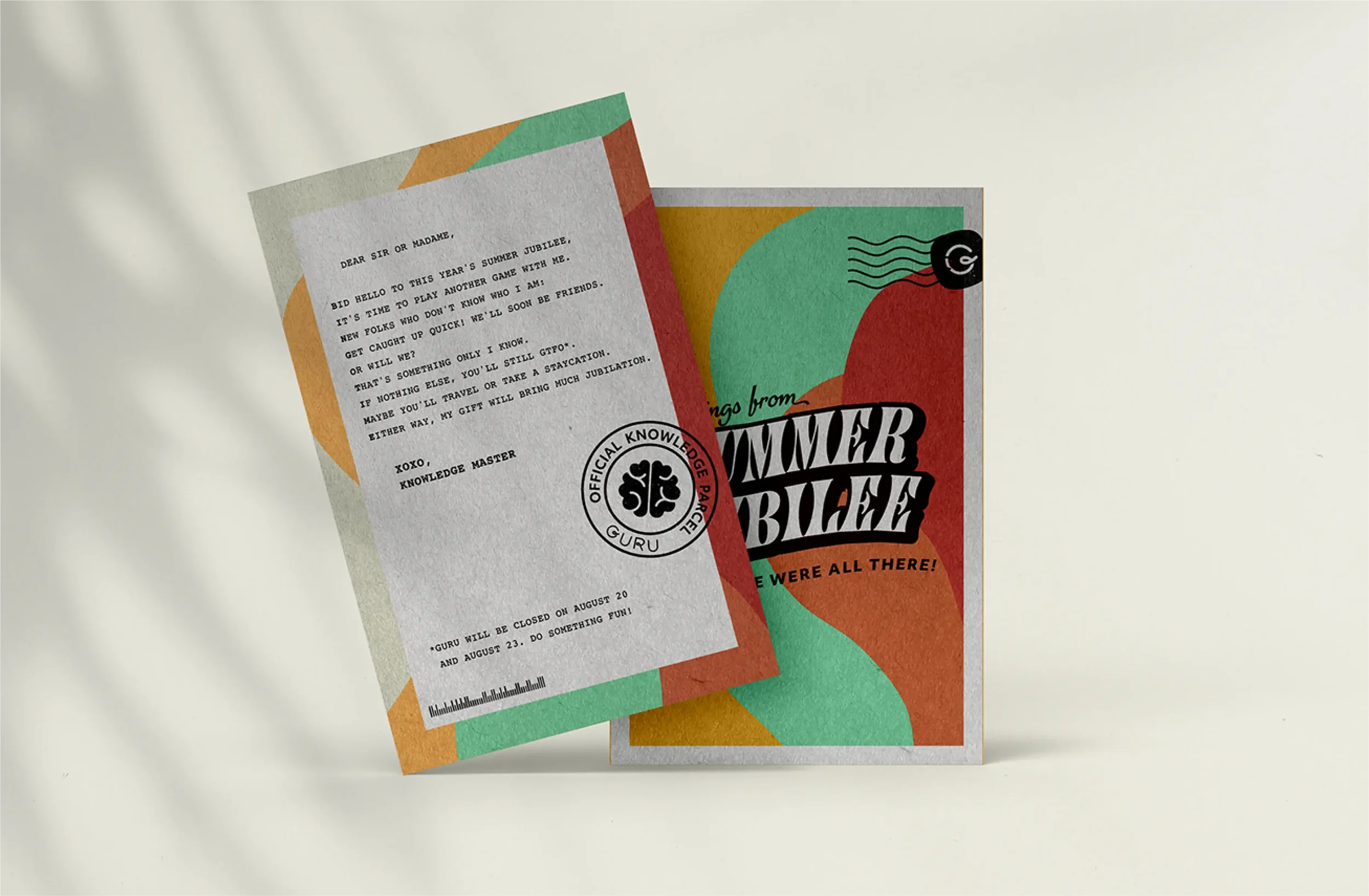 For Guru’s annual Sales Kickoff, Summer Jubilee, I created a vintage-inspired subbrand designed to spark connection and excitement during a fully remote event. The visual identity featured bright yet soft summery colors and nostalgic imagery reminiscent of retro postcards and vacation souvenirs. As part of the experience, I also designed a curated box of custom items sent to each team member.